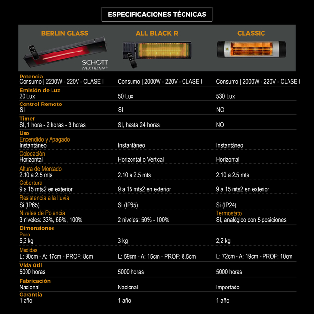 - Ideal para calefaccionar espacios abiertos o semi cubiertos, como galerías, patios, pérgolas, terrazas, quinchos, jardines, balcones, veredas, bajo toldos, etc. Y también espacios cerrados amplios que requieran calefacción por sectores.